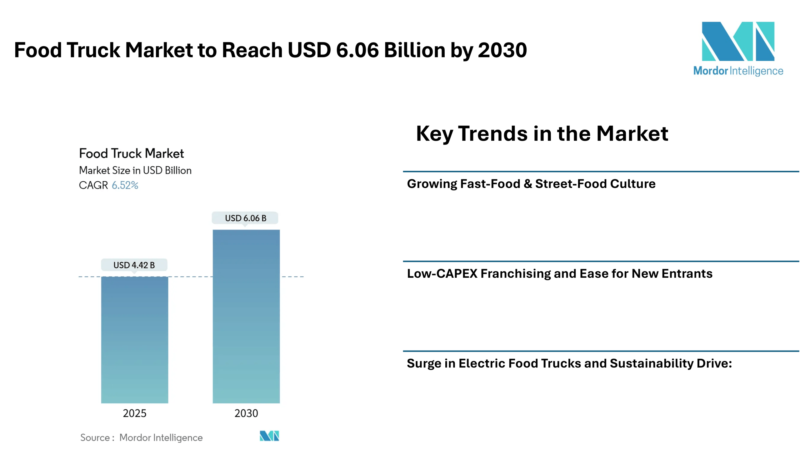 Low-CAPEX Franchising and Ease for New Entrants: Compared to opening a traditional brick-and-mortar restaurant, launching a food truck requires lower initial investment. This makes the food truck market accessible to entrepreneurs and small-business owners.