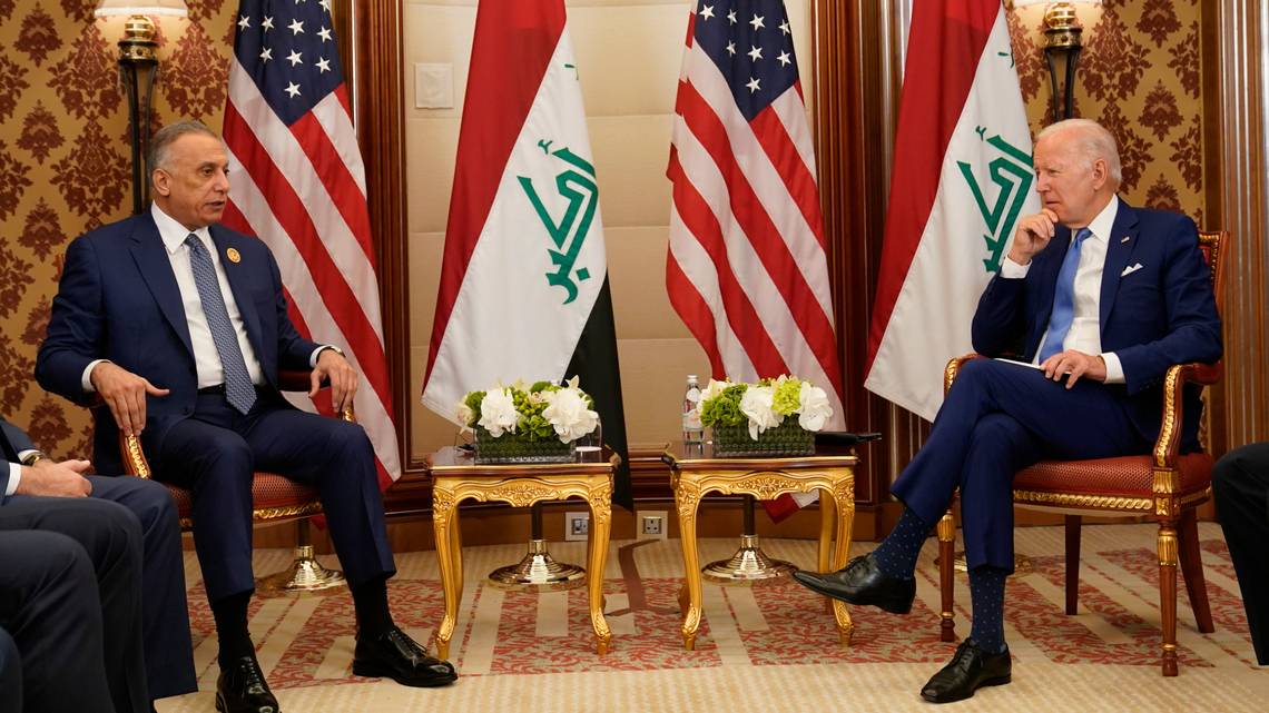 President Joe Biden meets with Iraqi Prime Minister Mustafa Al-Kadhimi, Saturday, July 16, 2022, in Jeddah, Saudi Arabia. (AP Photo/Evan Vucci)